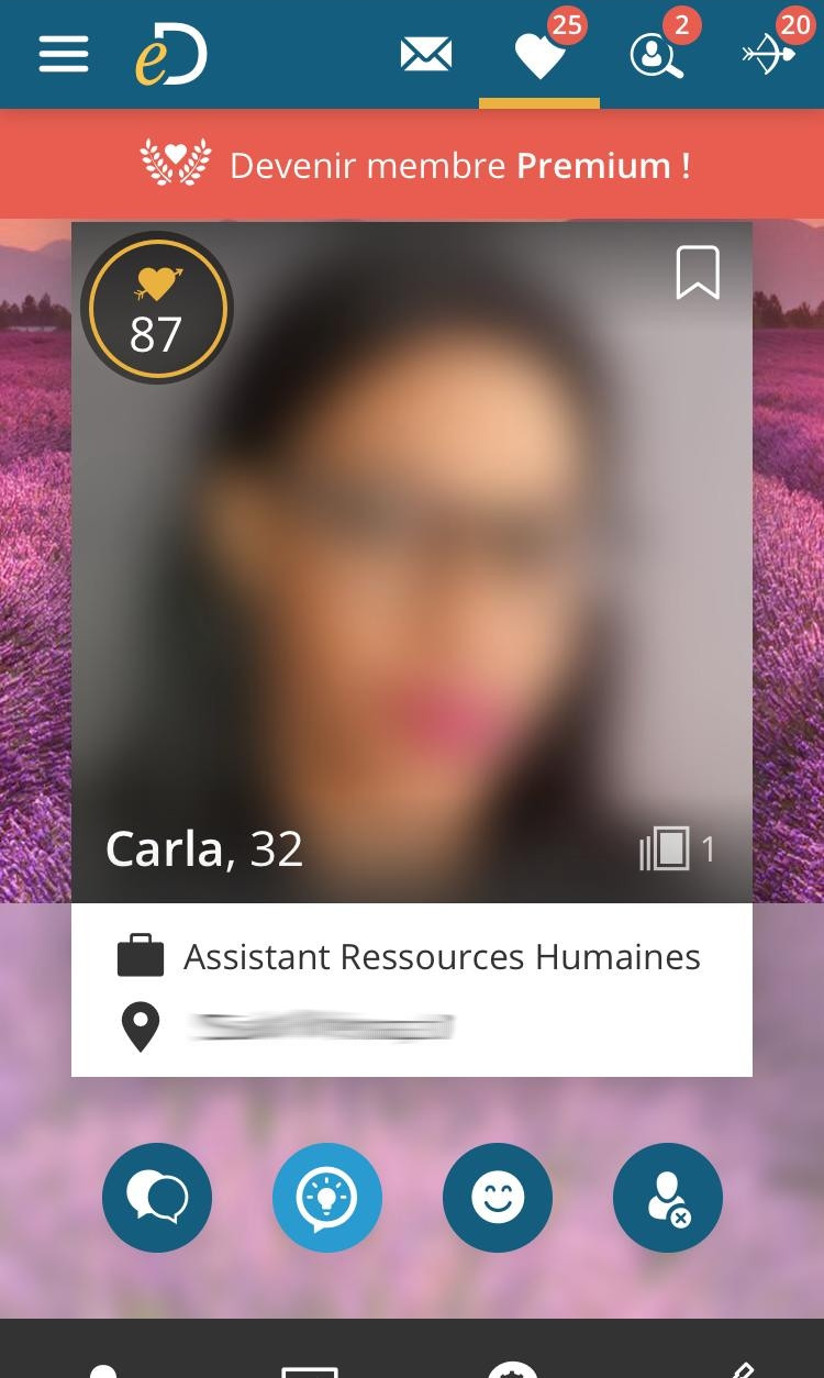La section « À vous de jouer » nous permet de trouver d’autres membres par rapport à ceux de « Profils compatibles ». Elle présente donc des profils qu’on n’a certainement pas vus pour augmenter nos chances faire une rencontre. On y voit l’essentiel de chaque profil : taille, origine, envies d’enfants, métier, niveau d’étude, et bien sûr la photo de profil. On peut donc cliquer sur le smiley souriant si le membre nous plait (et obtenir un potentiel match si on lui plait aussi), soit cliquer sur la croix pour passer au profil suivant. Si au premier abord on n’est pas sûr, on peut aussi visiter le profil pour voir les détails.