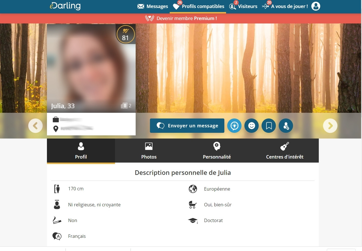 Grâce au test de personnalité, le système de matching proposé par eDarling donne de très bons résultats. Pour les voir, il suffit de se rendre dans la section « Profils compatibles ». Disponible dans le menu du haut. Chaque jour, on y trouve environ 20 à 30 profils dont le taux de compatibilité est élevé par rapport au nôtre. C’est sans hésitation la section la plus importante du site.