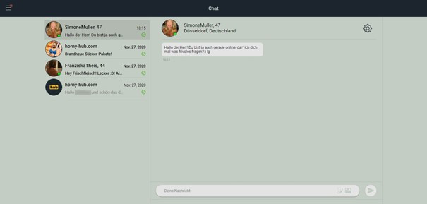 Selbstverständlich verfügt Horny-hub - genau wie alle anderen Dating-Seiten - über einen Chat. Es handelt sich hier um herkömmliches System für den Austausch von Nachrichten und Fotos.